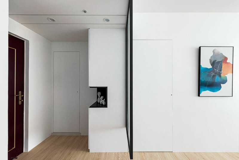 老屋原有的長型空間及隔間讓空間顯得侷促與狹隘,尤其是大門進到空間之中,走道因隔間而限縮了場域,為了讓人進到空間有更開闊的感受,設計師在規劃時將屋主所需納入,依比例劃分移除隔牆,並設置懸空鐵件隔屏,一方面可以阻絕視線直接貫穿到窗戶避開穿堂煞,另一方面可以讓人進到空間有短暫的緩衝,形成一個小玄關。