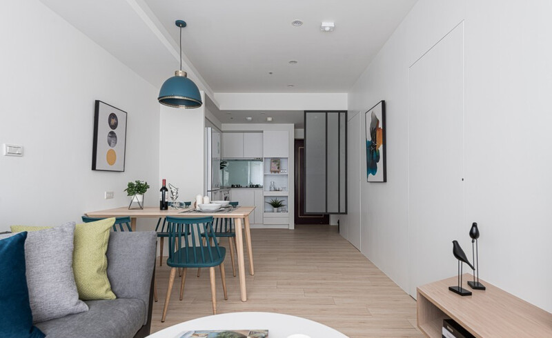 經由格局的規劃,將隔牆移除釋放出空間,並導入色彩計畫,創造更好的空間體驗。整體色彩以白色為基底,光線透過白色窗紗進到空間,柔和且明亮感讓整體開闊,木質的溫潤、鐵件的型態、虛實的線條,在幾何形面的轉折之間,營造出不一樣的視覺感,輔以家具、家飾、軟件,尤其是高級藍的色澤,為小小空間創造出家的溫馨。