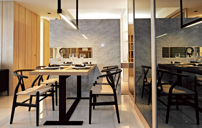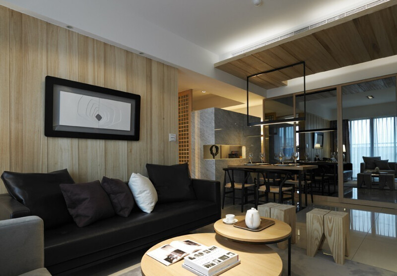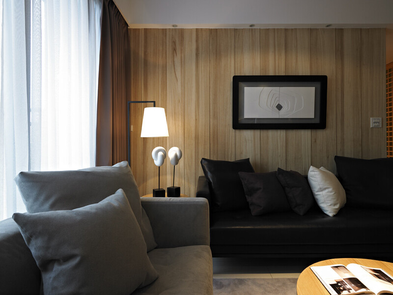 聳直的紋路與橫列的線條,形成一種行徑,進到屋內有如一種空間的轉換,如同置身在靜謐的林間,煩雜城市的喧囂隨之隱沒,心境舒緩沉澱之間有了最適宜的放鬆;黑色鏡面反射著空間的樣態,光線隨著白紗映照入內,遞延了生活最真實的一面。