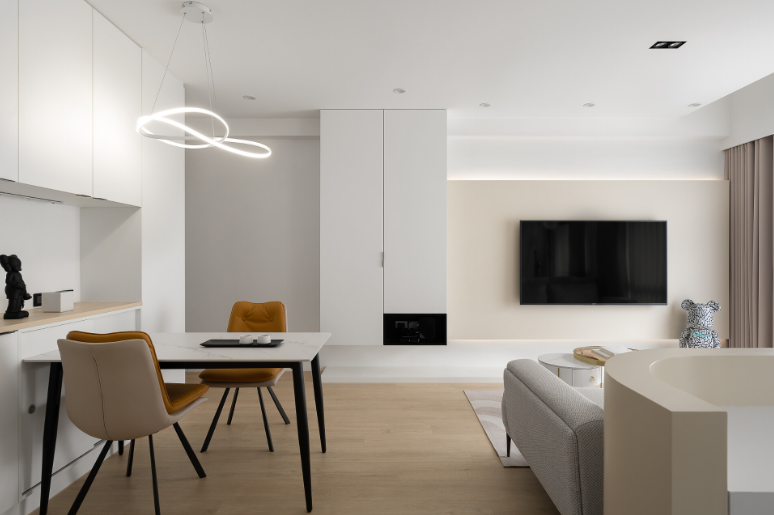 在不到二十坪的空間裡,為了能讓空間的使用更具美觀與機能性,除了顏色的運用之外,從一進門的鞋櫃及汙衣櫃、電視牆的收納及機櫃、餐廳的餐櫃、書桌下的收納櫃等都考量到使用者的需求。主臥室利用書房一段的退縮空間打造開放更衣室,巧妙的設計讓空間感加成。小宅在合宜的規劃下,簡約中溫馨而舒適。