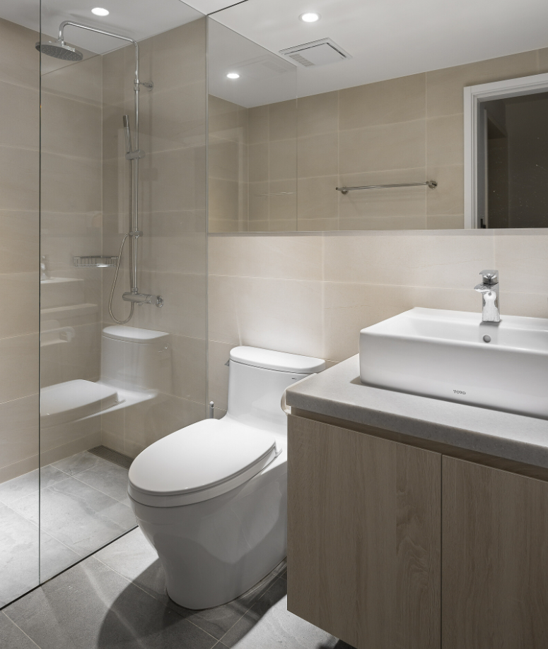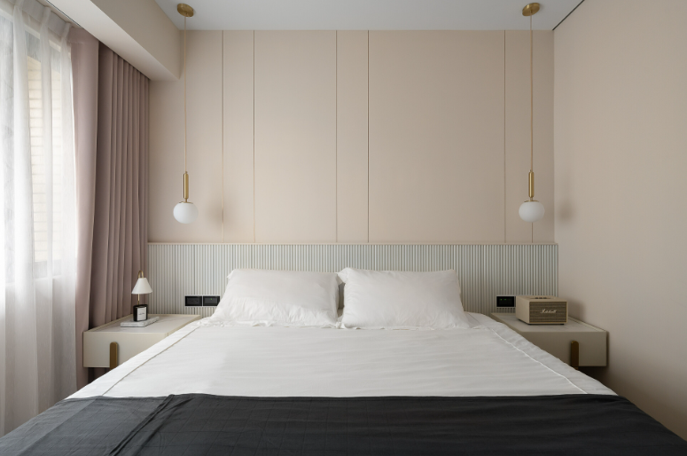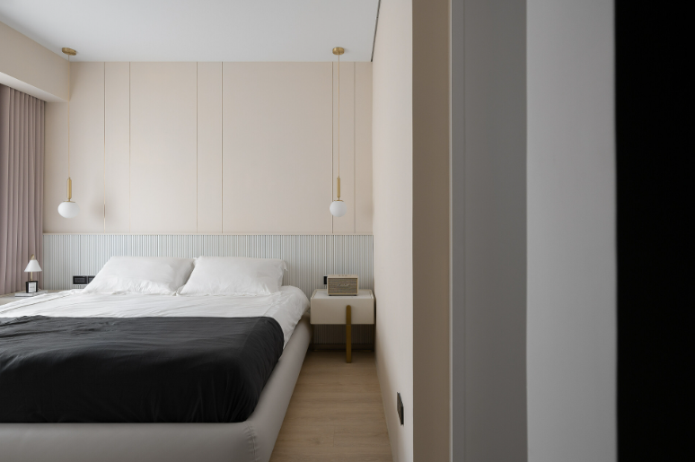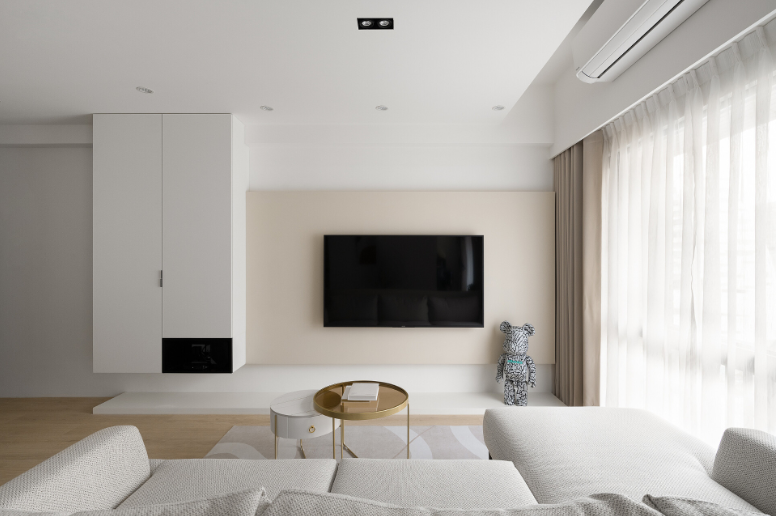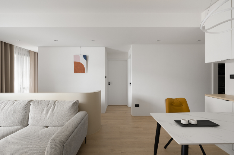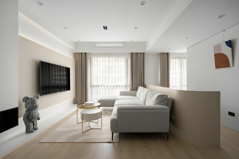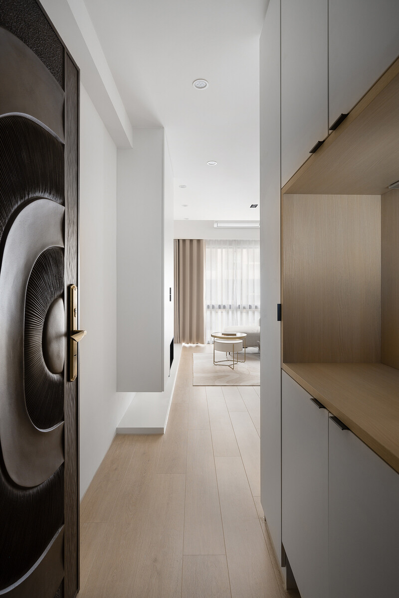 空間以白色為基底,搭配淺色的大地色系使牆面具有層次並兼具溫潤感,除了使人在空間的感受溫馨舒適之外,更具有放大的視覺效果。地坪採用木材質地的地板,溫潤觸感及色調和空間的顏色相呼應,此一手法的運用從公領域延續到私領域空間,讓使用者在各場域的感受上有延續性。