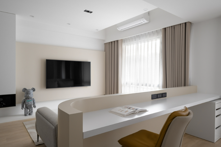 設計的思考以打造質感溫馨的住居為發想,不用過多的皮相材質,以單純的幾何構造形塑空間的簡約氛圍。將原有的臥室隔間移除,納入原有的落地窗採光和客廳的落地窗連結使光線更充足,並將客廳天花拉高和書房前緣橫樑包覆使二個場域的空間形成層次,視線上無阻隔感受更開闊的空間。