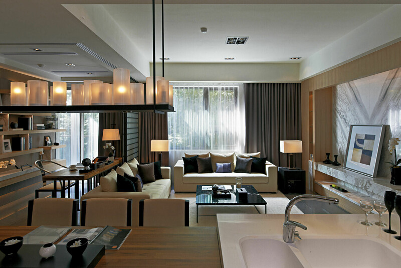 玄關以木材質形塑出整體空間的溫潤感受,開放式的空間運用清新素雅的色系貫穿整體空間主軸。客廳以簡約白色為基底,運用潔白地毯框出區域限定,並藉著深淺色家具讓色系之間相輔相成,以黑白兩色延伸出完美的平衡感。電視牆銀狐石展現出大器氛圍,藉由天然栓木皮平衡冷調性,讓客廳因白色而呈現高雅,圍塑出典雅品味的極致空間。