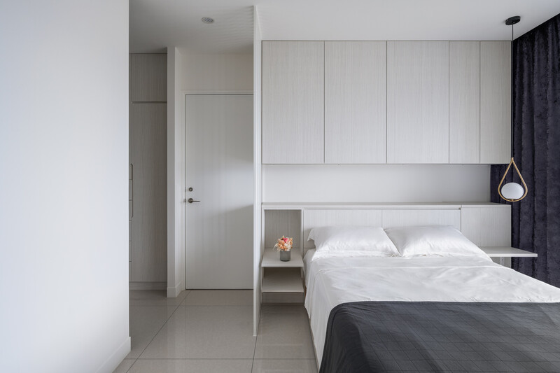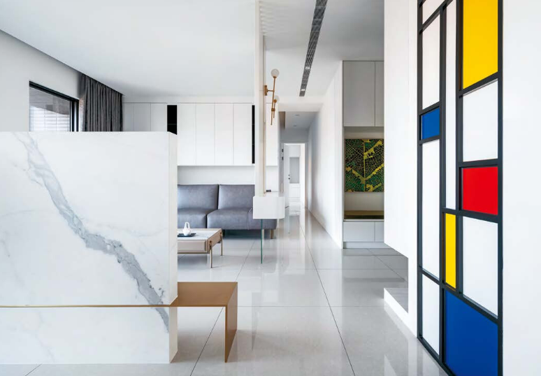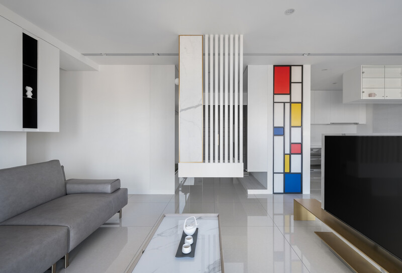 屏格二端的軸線上,經由廊道可至其他臥室,白色為基底的空間中,線條的引導下讓視覺延伸,加上地面磚的映照延續,擴大了空間的感受。場域的景深藉由線性和幾何設計,線條的延伸下,使矩行幾何呈現不同視感,加上拋光磚地面的映照延伸,營造出遠近的層次。長形空間依比例劃分區域,每個區域趨近於方正空間,使人在空間中有最佳的舒適感。
