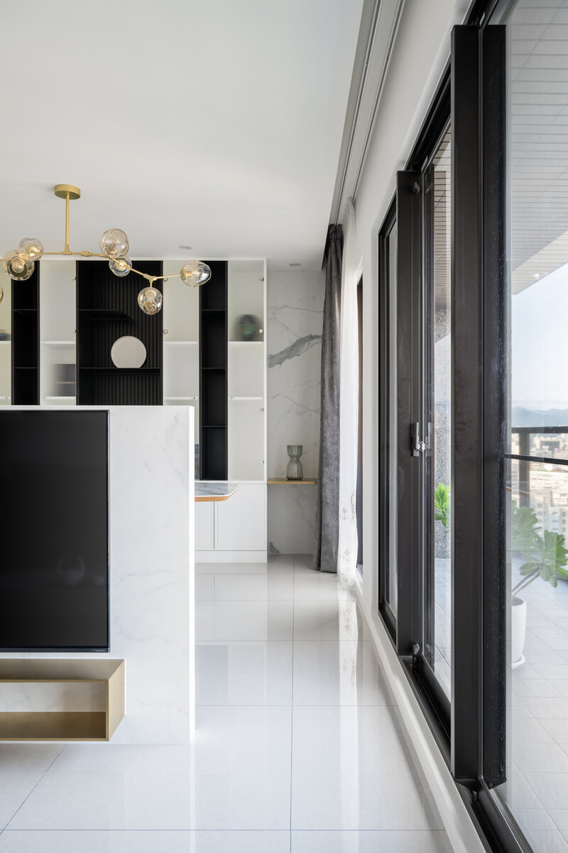 玄關和客廳之間以格柵屏格作為界分場域的界線並賦予實用機能。線條的虛實構成了穿透及遮蔽的視覺感,除了營造光線的明暗表情之外更讓空氣穿過流動。大面積落地窗讓戶外如畫的景致一覽無遺,為了區隔場域並營造隱約的視感,由線條陣列的設計想法為開端,以懸浮鐵件格柵造型完成。將縱長型格局有計畫地劃分為生活使用機能等正方形場域並融入大量收納空間,行隨機能之餘,人在空間中的感受更加舒適。地磚、落地窗在線條的架構下構成了面,延續線、面的構成,成為設計延伸。利用大面積落地窗的優勢,引進大量的光線使空間明亮,並將窗框的幾何語彙應用到空間之中。矩形幾何造型勾勒出虛實的相互關係,並運用地面的映照創造出層次視感,在進退之間均可以感受到空間端景,隱藏性的將收納機能融於整體設計之中,使整體美感和機能兼具。
