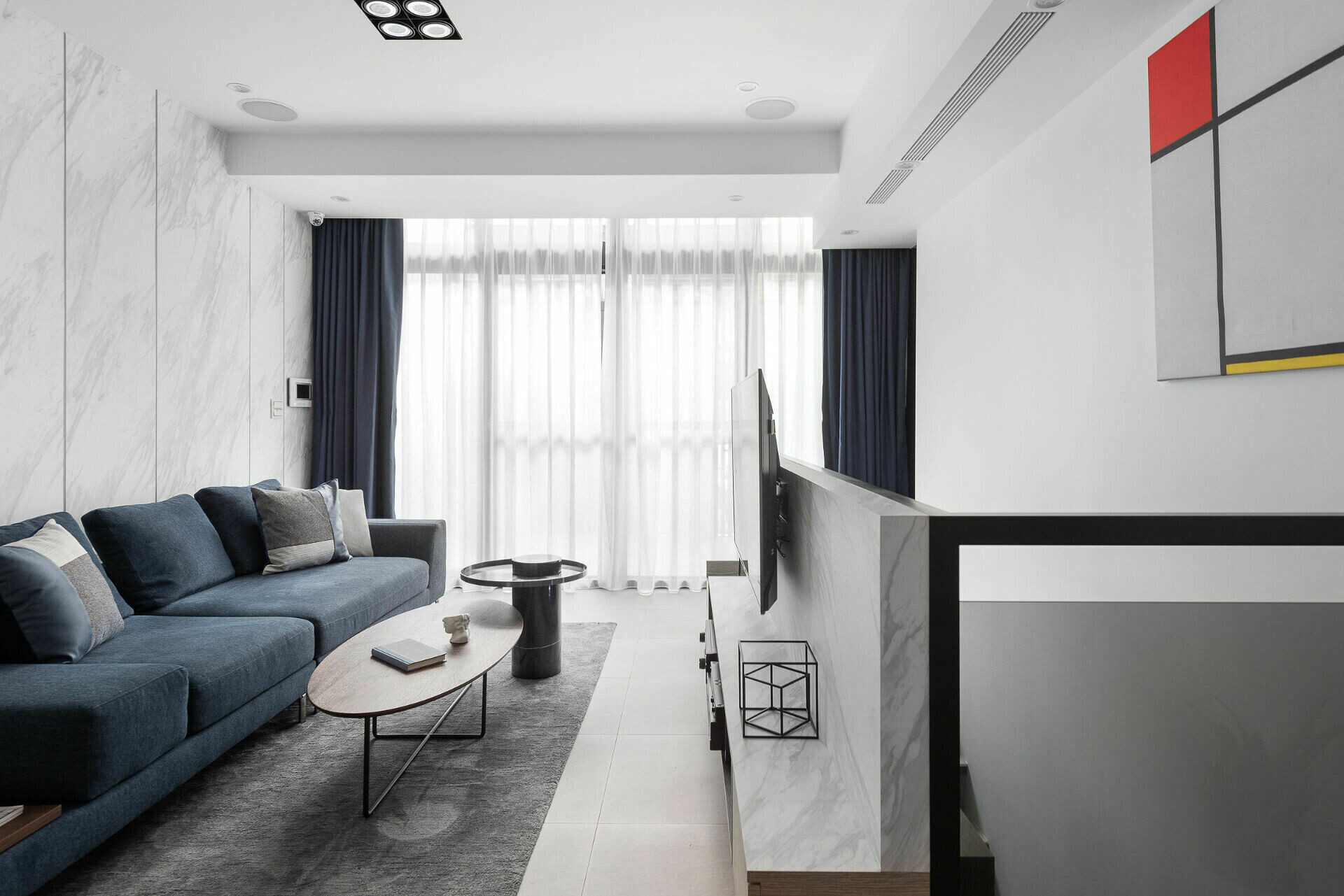 空間,屏除繁複的皮相,以單純的線進行,線的劃分構成了面,經緯交織使面的呈現有了豐富的樣貌。住家給人舒適之外也要可以長時間的居住,純粹的空間就會給人安心感。線性的衍生,純粹的空間是此案設計的想法。源自於對環境的觀察,建築本體及公共大廳天花垂吊的格柵線條,梯廳牆面間石材的拼接劃分隔線語彙呈現一種現代美感,將這樣的語彙轉移,線條勾勒或顯現、或隱藏於空間之中。空間以白色為基底,線性為架構,線和面、幾何的構成,營造出線條和幾何的純粹,加入虛實的設計手法,表達空間的簡約質性。