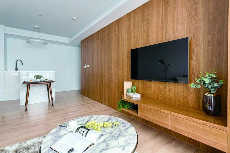 將整面牆體從餐廳延伸到客廳,隱藏式設計手法讓木紋面得以延伸,溫潤的木材質在紋路的帶動下,營造如置身森林之感,享受自然的意境。在光線的帶動下,明顯的肌理,和沙發區白色牆面的對照下,讓視覺更具張
