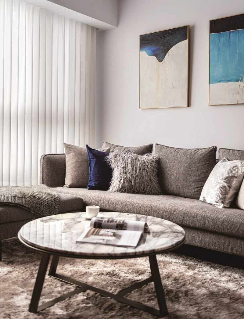 藉由大面積窗戶所引進的光線,讓空間視覺感受放大。原本天花不良的樑柱影響公領域空間,利用單側的間接照明,不但消彌了視線障礙,也讓燈光隱藏於內。美觀場域整體更兼顧空間照明的目的。