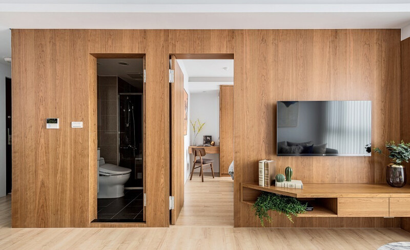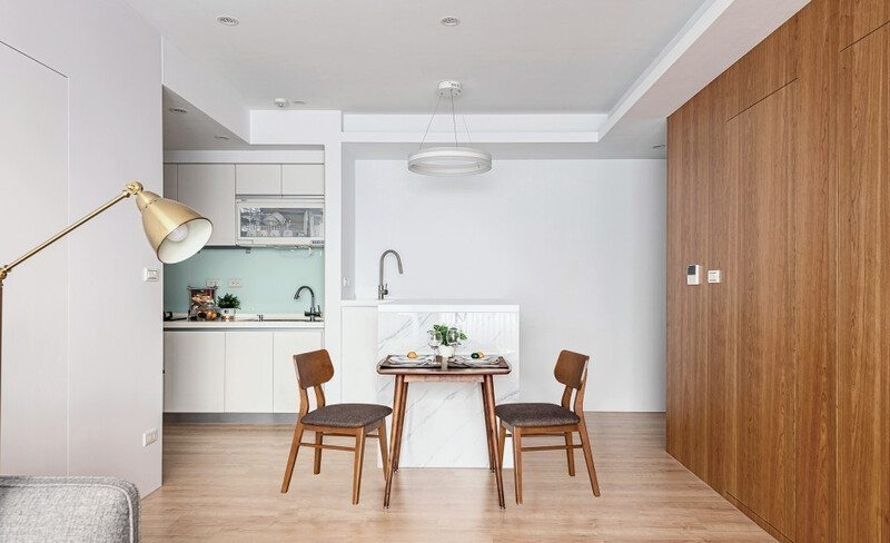 白色為基地的空間中,木質媒介材質由公領域延伸至私領域,大門內側原先露出的櫃體移除,以儲藏室的機能置入,讓這個小小空間有更大的發揮。玄關為長型,沿著牆面低處設置端景台,也可以當成座椅及穿鞋椅,美觀機能兼具。