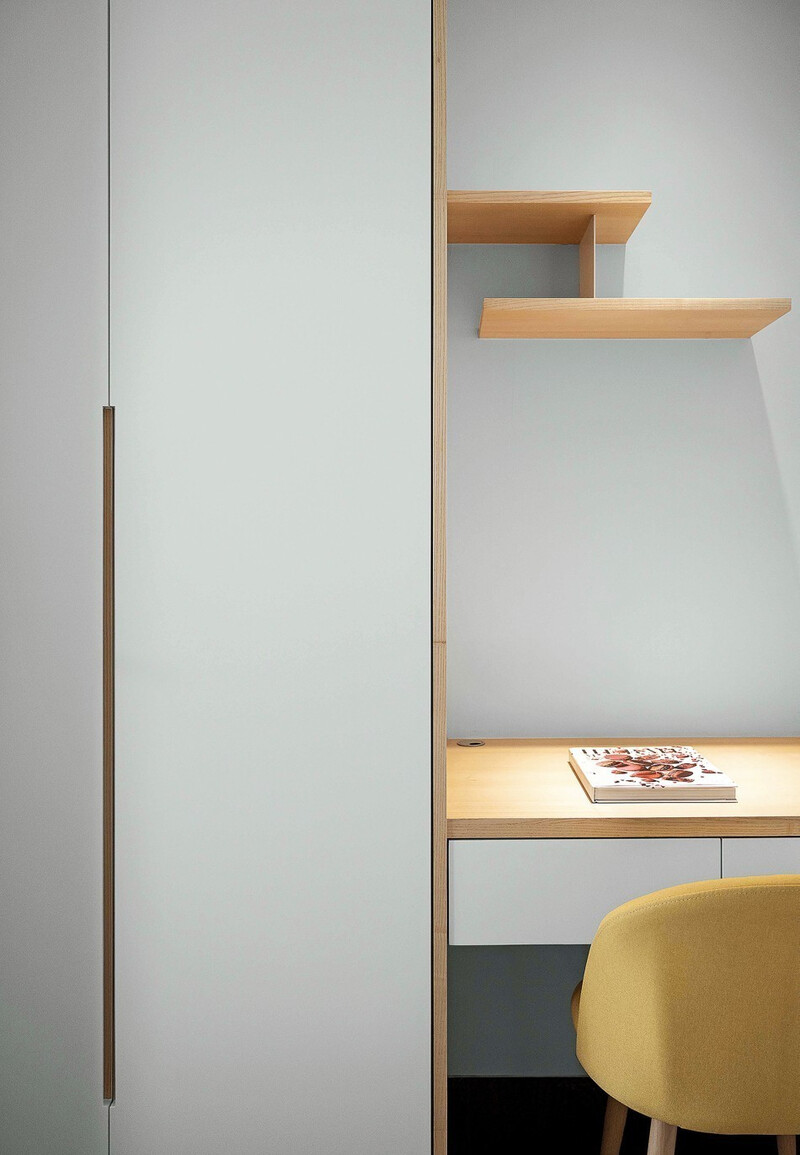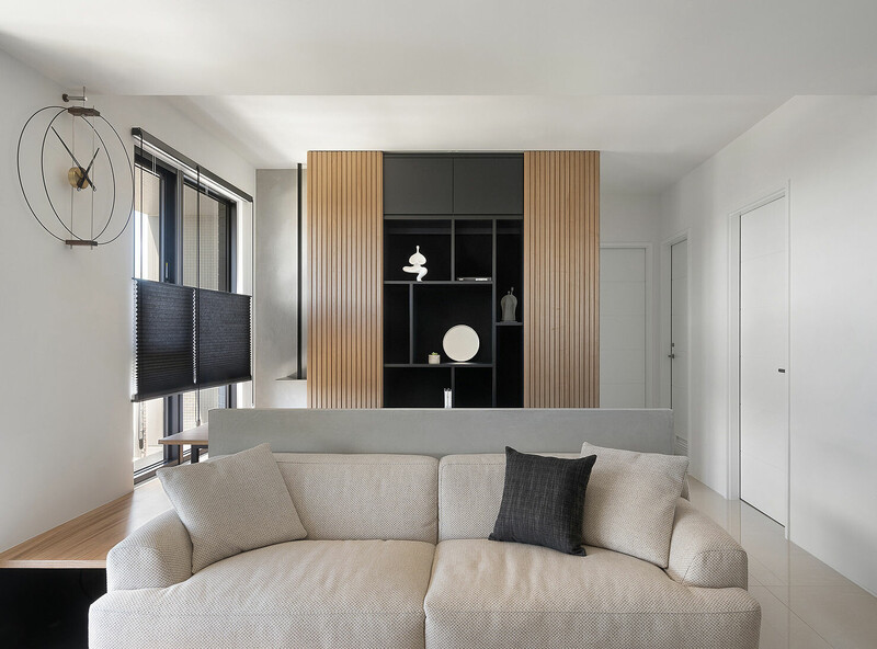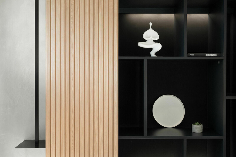 除了材質的反差之外也形成空間的層次。線的虛實延續到閱讀區、使用者愛貓,在閱讀區臥榻設計了圓形的貓洞,前後可相通,讓貓可以自由的活動。整體空間在線性、幾何的架構下,使空間純粹而豐富,簡約而舒適的空間,融入了機能收納的使用,美感與機能兼備,更能符合現代設計的需求。