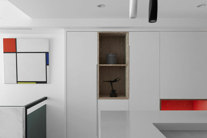 空間,屏除繁複的皮相,以單純的線進行,線的劃分構成了面,經緯交織使面的呈現有了豐富的樣貌。住家給人舒適之外也要可以長時間的居住,純粹的空間就會給人安心感。線性的衍生,純粹的空間是此案設計的想法。源自於對環境的觀察,建築本體及公共大廳天花垂吊的格柵線條,梯廳牆面間石材的拼接劃分隔線語彙呈現一種現代美感,將這樣的語彙轉移,線條勾勒或顯現、或隱藏於空間之中。空間以白色為基底,線性為架構,線和面、幾何的構成,營造出線條和幾何的純粹,加入虛實的設計手法,表達空間的簡約質性。