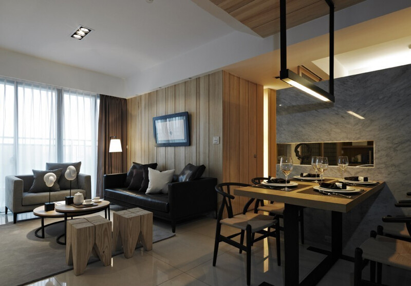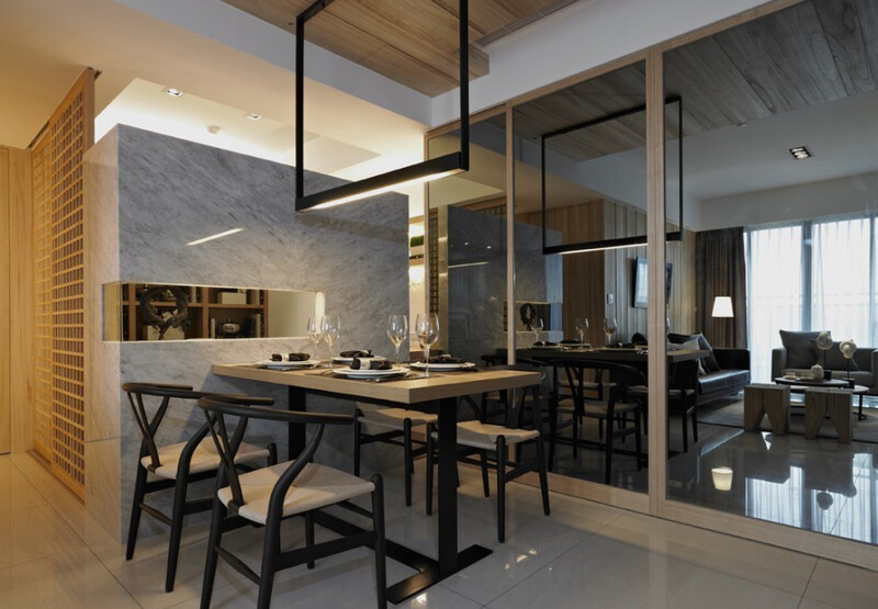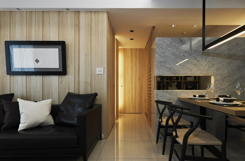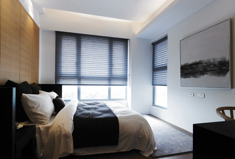 聳直的紋路與橫列的線條,形成一種行徑,進到屋內有如一種空間的轉換,如同置身在靜謐的林間,煩雜城市的喧囂隨之隱沒,心境舒緩沉澱之間有了最適宜的放鬆;黑色鏡面反射著空間的樣態,光線隨著白紗映照入內,遞延了生活最真實的一面。