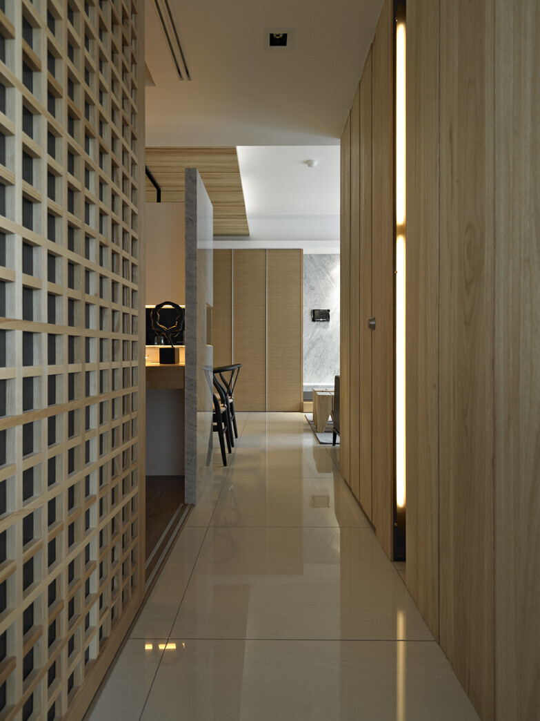 木質紋路天花猶如鄉間林徑,引領動線進到空間之中,沙發區、廊道間,垂直的木紋肌理更加深了此一林間意象,光線透過白色紗簾在場域間遊走,不但開闊了視線也明亮了空間。