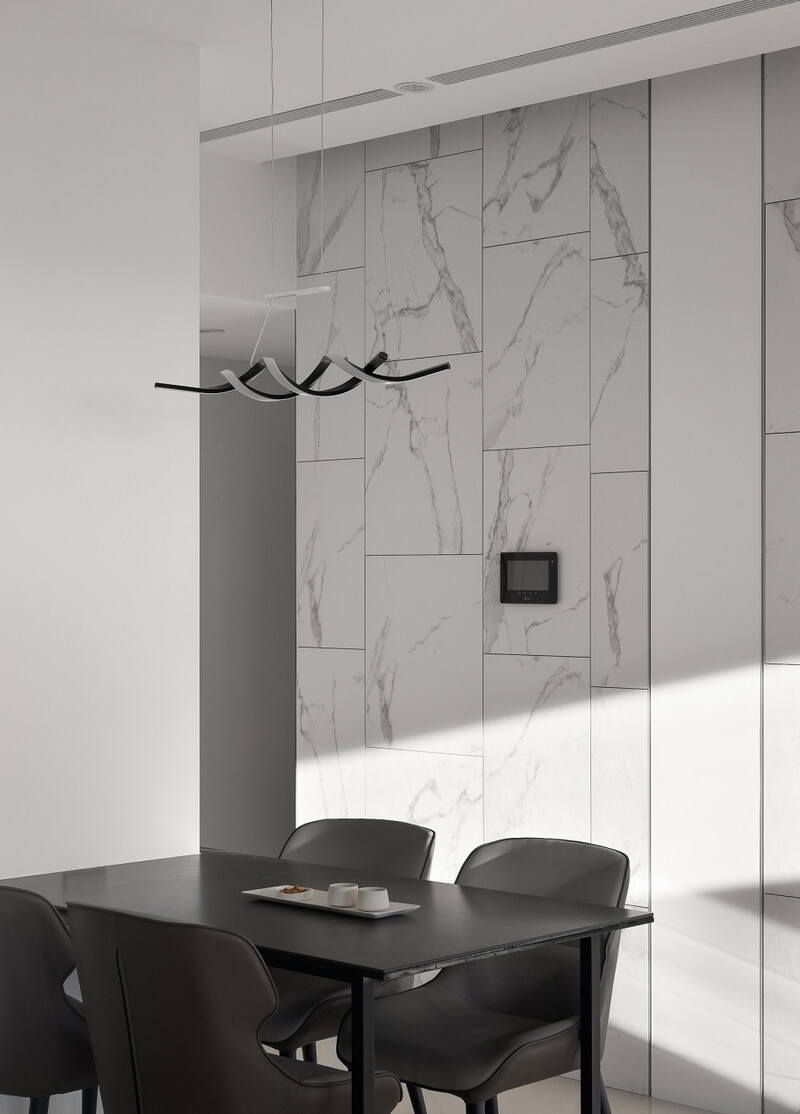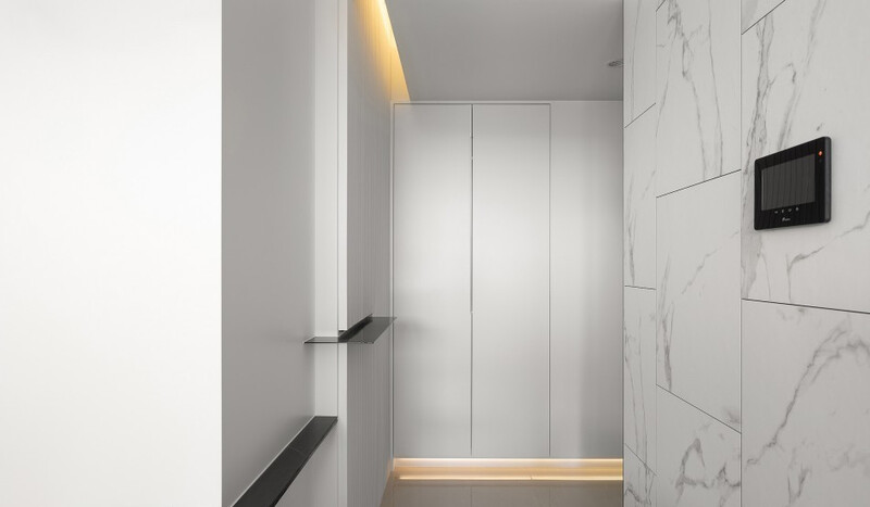 在空間中,線的單一、陣列、延伸組構成面,輔以家飾的圓,線性中融入了非線性,方中有圓、圓中有方,亦是生活中理性與感性的結合。經由構圖和色彩單純的形式,體現秩序現象與均衡之美,藝術增加了空間的質感,並導入智能式生活,打造一個智慧居家及自然舒適的環境。